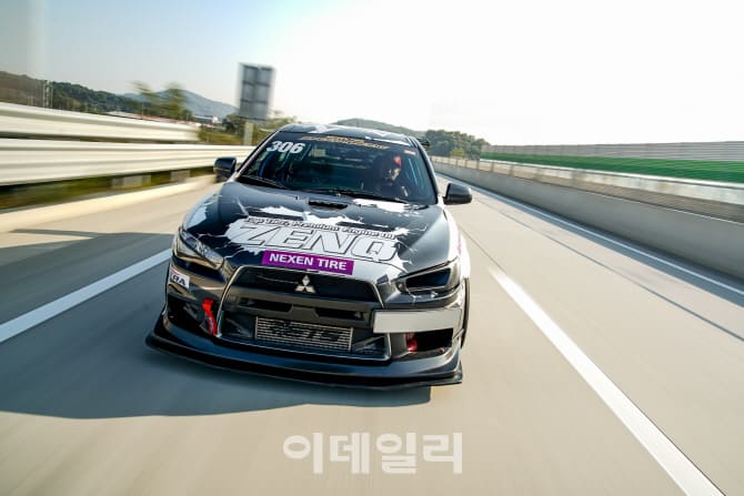 지난달 21일 강원도 인제군 인제스피디움에서 열린 ‘2018 넥센 스피드레이싱’ 최종전에서 엔진오일 ‘젠큐’를 사용한 랜서에볼루션이 트랙을 돌고 있다. 성보산업 제공